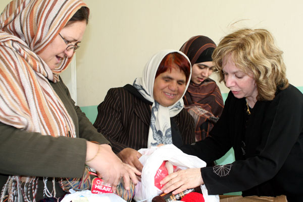 Rubia's Rachel Lehr helps sort through donated yarn